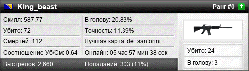 | de_mirage | 8 | 0.67 | 0.22 | 2 | 25 | 00:35:47 | 05.12.2016 | |