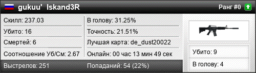 | de_dust20022 | 15 | 3.00 | 1.54 | 1 | 8 | 00:09:43 | 15.02.2016 | |