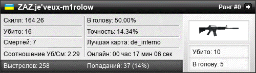 de_inferno | 16 | 2.29 | 0.94 | 1 | 12 | 00:17:06 | 27.10.2015 |