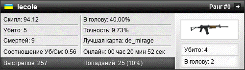 | de_mirage | 5 | 0.71 | 0.30 | 1 | 11 | 00:16:44 | 27.10.2015 | |