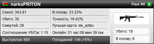 | de_aztec | 13 | 1.62 | 0.60 | 1 | 14 | 00:21:42 | 31.03.2016 | |
