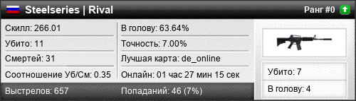 | 22.05.2018 @ 07:09 - 07:10 | de_cbble | 00:01:27 | 0 | 1 | 0 | 0.00% | 7.14% | 252.73 |