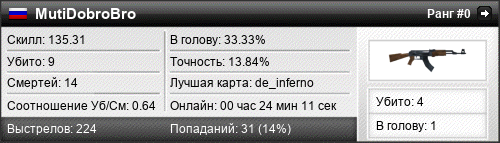 | de_inferno | 9 | 0.64 | 0.37 | 2 | 16 | 00:24:11 | 30.10.2015 | |