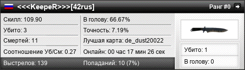 | de_dust2 | 1 | 0.50 | 0.23 | 1 | 3 | 00:04:20 | 28.10.2015 | |