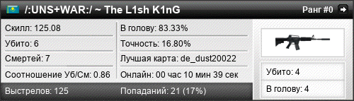 | de_dust20022 | 6 | 0.86 | 0.56 | 1 | 8 | 00:10:39 | 28.10.2015 | |