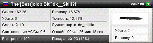 | de_militia | 4 | 0.67 | 0.25 | 2 | 11 | 00:16:06 | 03.03.2016 | |