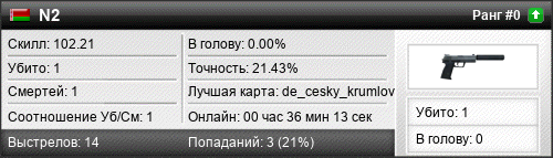 | 07.07.2024 @ 19:26 - 19:27 | de_avangard | 00:00:54 | 0 | 0 | 0 | 0.00% | 0.00% | 102.21 |