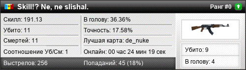 | de_nuke | 9 | 3.00 | 0.77 | 1 | 7 | 00:11:38 | 06.03.2016 | |