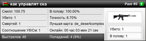 | 11.03.2016 @ 18:56 - 18:58 | de_desertcomplex | 00:02:05 | 1 | 1 | 1 | 100.00% | 8.70% | 102.75 |