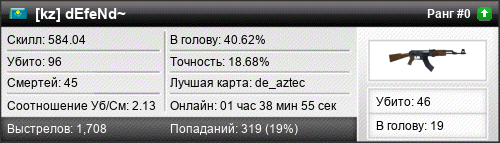 | 12.03.2016 @ 09:28 - 09:43 | de_train | 00:15:38 | 18 | 8 | 5 | 27.78% | 17.27% | 241.01 |