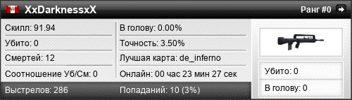 | de_inferno | 0 | 0.00 | 0.00 | 1 | 14 | 00:23:27 | 29.10.2015 | |