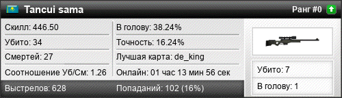 | de_mirage | 11 | 1.57 | 0.70 | 1 | 10 | 00:15:39 | 14.03.2016 | |
