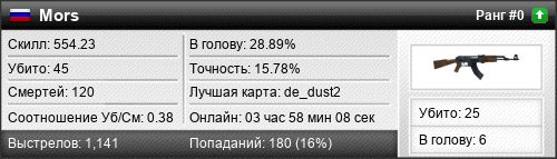 | de_inferno | 8 | 0.44 | 0.16 | 3 | 40 | 00:48:56 | 16.12.2025 | |