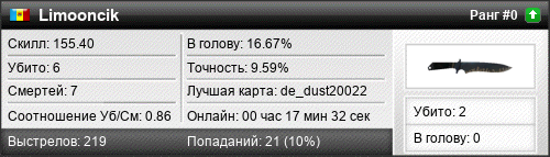 | de_dust20022 | 5 | 1.00 | 0.42 | 1 | 8 | 00:11:55 | 16.03.2016 | |