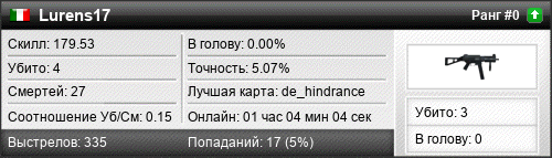 | 19.03.2016 @ 05:42 - 06:01 | de_hindrance | 00:18:59 | 3 | 10 | 0 | 0.00% | 5.03% | 179.53 |