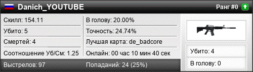 | de_badcore | 5 | 1.25 | 0.87 | 1 | 4 | 00:05:43 | 24.03.2016 | |