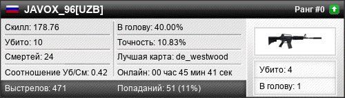 | de_assault | 5 | 0.45 | 0.21 | 1 | 16 | 00:23:29 | 24.03.2016 | |