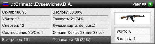 | de_dust2 | 12 | 1.00 | 0.45 | 3 | 17 | 00:26:43 | 29.03.2016 | |