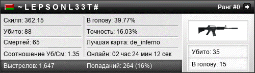 | de_inferno | 52 | 1.68 | 0.86 | 1 | 38 | 01:00:44 | 01.11.2015 | |