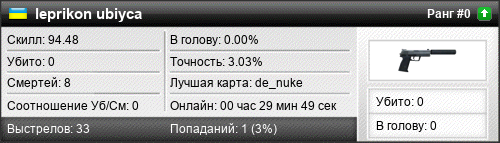 | 19.03.2016 @ 15:05 - 15:13 | de_zero_city | 00:08:05 | 0 | 4 | 0 | 0.00% | 4.55% | 94.50 |