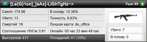 | 01.05.2016 @ 16:16 - 16:40 | de_office | 00:24:44 | 13 | 10 | 2 | 15.38% | 9.33% | 174.96 |