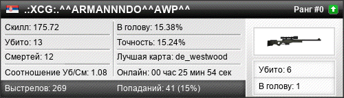 | 06.05.2016 @ 12:04 - 12:27 | de_westwood | 00:22:51 | 13 | 11 | 2 | 15.38% | 14.96% | 173.77 |