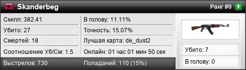 | 30.03.2017 @ 06:18 - 06:53 | de_dust2 | 00:35:33 | 23 | 15 | 2 | 8.70% | 15.81% | 335.61 |