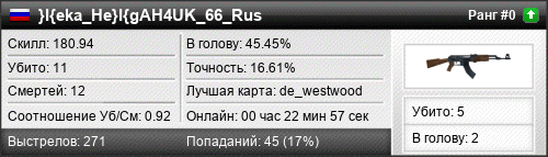 | de_dust2 | 4 | 0.57 | 0.34 | 1 | 9 | 00:11:55 | 15.04.2016 | |