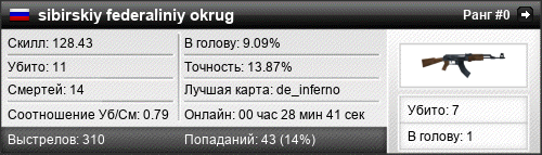 | de_inferno | 11 | 0.79 | 0.38 | 1 | 20 | 00:28:41 | 31.10.2015 | |