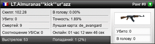 | de_aztec | 0 | 0.00 | 0.00 | 2 | 2 | 00:02:19 | 20.04.2016 | |