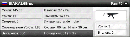 | de_nuke | 7 | 1.40 | 0.79 | 1 | 7 | 00:08:51 | 31.10.2015 | |