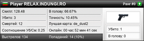 | 23.04.2016 @ 12:25 - 12:46 | de_train | 00:20:43 | 3 | 12 | 2 | 66.67% | 10.45% | 128.48 |
