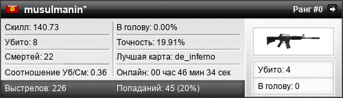 | de_inferno | 2 | 0.33 | 0.26 | 1 | 6 | 00:07:49 | 31.10.2015 | |