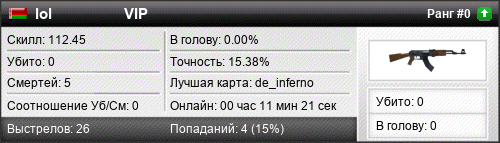 | de_inferno | 0 | 0.00 | 0.00 | 2 | 2 | 00:03:37 | 27.04.2016 | |