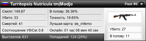 | de_inferno | 33 | 0.80 | 0.48 | 17 | 43 | 01:08:40 | 02.11.2015 | |