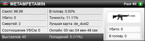 | de_dust2 | 0 | 0.00 | 0.00 | 1 | 2 | 00:02:48 | 04.05.2016 | |
