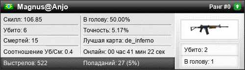 | de_inferno | 3 | 0.43 | 0.19 | 1 | 9 | 00:15:44 | 06.05.2016 | |
