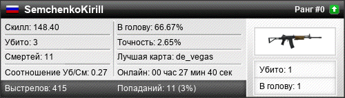 | de_vegas | 3 | 0.38 | 0.14 | 1 | 15 | 00:20:57 | 07.05.2016 | |