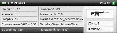 | 01.11.2015 @ 16:10 - 16:19 | de_dust2 | 00:08:29 | 1 | 4 | 0 | 0.00% | 23.68% | 98.25 |