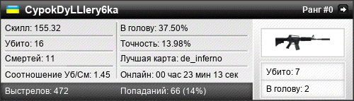 | de_inferno | 16 | 1.45 | 0.69 | 2 | 15 | 00:23:13 | 02.11.2015 | |