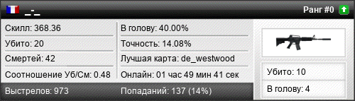 | 26.11.2020 @ 21:35 - 21:45 | de_cpl_fire | 00:09:41 | 0 | 0 | 0 | 0.00% | 0.00% | 335.33 |