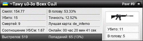 | de_inferno | 15 | 1.67 | 0.73 | 1 | 14 | 00:20:41 | 02.11.2015 | |