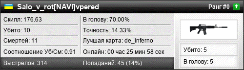 | de_mirage | 5 | 0.83 | 0.33 | 1 | 10 | 00:15:19 | 29.05.2016 | |
