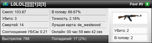 | de_westwood | 2 | 1.00 | 0.56 | 1 | 2 | 00:03:33 | 06.06.2016 | |