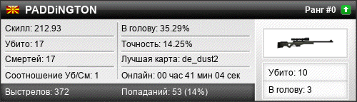 | 05.06.2016 @ 10:39 - 10:55 | de_cbble | 00:15:20 | 8 | 7 | 3 | 37.50% | 24.32% | 167.79 |