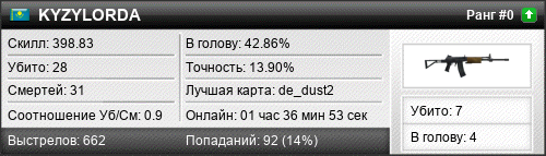 | 14.10.2018 @ 06:59 - 07:11 | de_mirage | 00:12:51 | 1 | 4 | 0 | 0.00% | 9.52% | 398.83 |