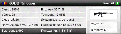 | de_dust2 | 16 | 1.45 | 0.78 | 2 | 15 | 00:20:31 | 28.07.2016 | |