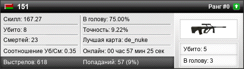 | de_nuke | 8 | 0.73 | 0.30 | 1 | 17 | 00:26:52 | 05.09.2017 | |