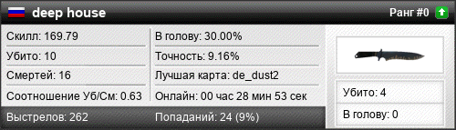 | de_dust2 | 7 | 0.64 | 0.34 | 3 | 14 | 00:20:39 | 01.09.2016 | |