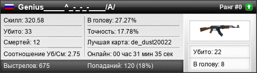 | de_dust20022 | 27 | 3.38 | 1.21 | 1 | 14 | 00:22:15 | 11.06.2016 | |